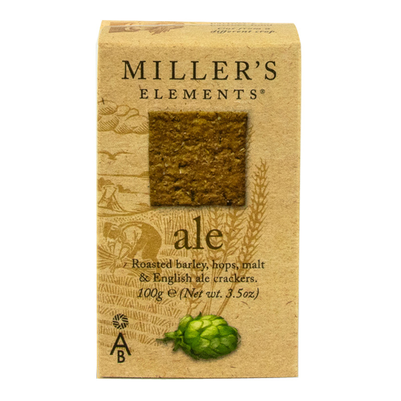 A deeply savoury and tweedy-textured, square cracker for cheese. Made from de-constructed beer ingredients: hops, roasted wheat, barley and malt, plus a generous splash of English Ale. The perfect cracker to partner a Ploughman’s Lunch. The miller’s best idea yet.
