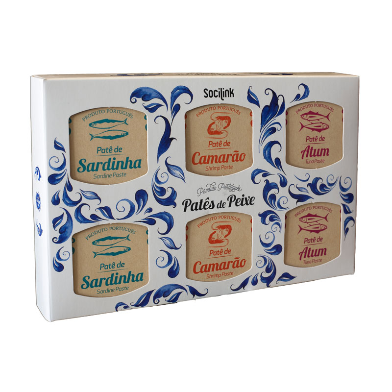A selection of 6 Fish Pates composed by: 2x Sardine Pate 65g; 2x Shrimp Pate 65g; 2x Tuna Pate 65g.