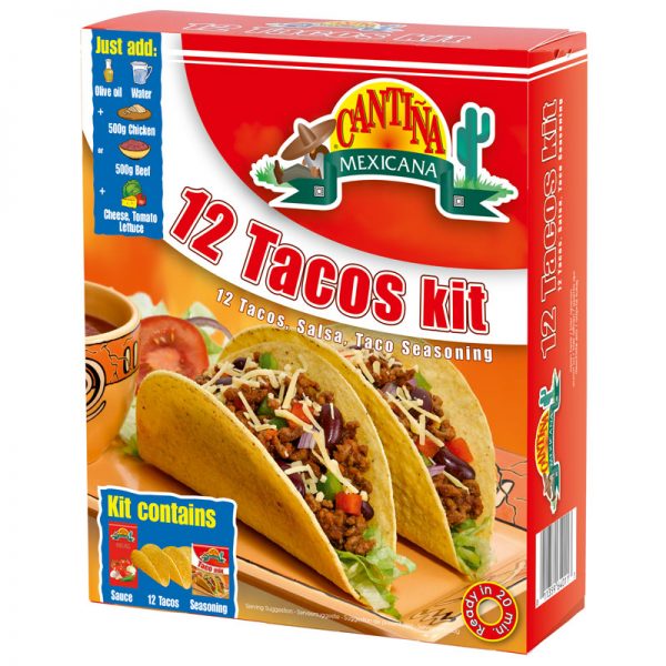 Mix the Cantina Mexicana Taco seasoning with 100mlwater. Add 1/2 tablespoon of oil to a frying and lightly brown the minced beef or chicken. Drain excess liquid and add the seasoning mix. Mix well and simmer for 10 minutes. Remove packaging and heat in oven taco shells with open-end down for 10-15 minutes (150ºC). Remove packaging and place Taco Shells on a microwave tray open end down. Microwave on high for 45 seconds until warm. Spoon minced beef mix into the tacos, add lettuce, top with tomato, cheese and salsa.