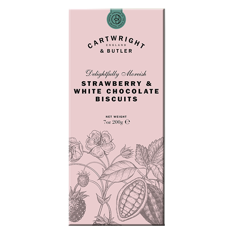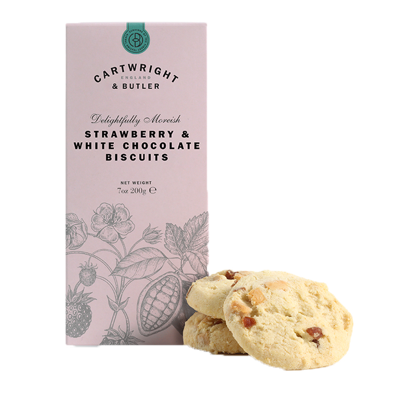 A crunchy, crumbly biscuit with dried strawberries and fine white chocolate chips. Cartwright and butler’s inspiration for this recipe came from a classic combination pattern, strawberries and white chocolate.