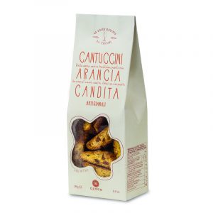 From the ancient Tuscan tradition, cantuccini with candied orange. The intense aroma of orange, given by the orange peel (crystallized slowly and at low temperature) gives these cantuccini a smoother consistency and an intense flavor.