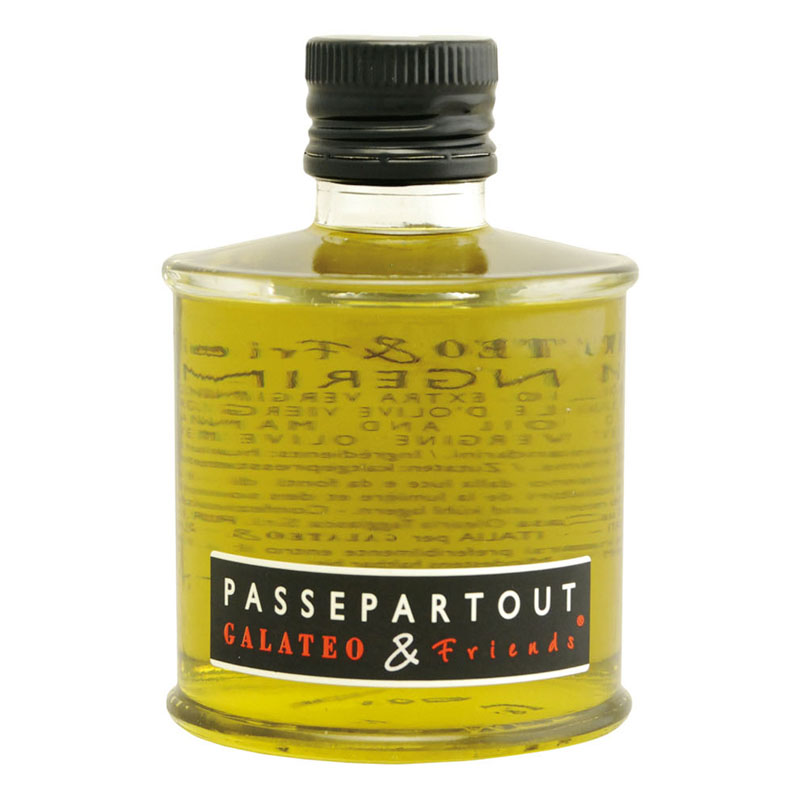 Certified tangerines grown in Sicily and olives owned by Galateo and Friends are cold processed in the property’s mill to produce this citrus-flavored oil. The water from the olives and the juice from the tangerines are eliminated during the crushing process, enhancing the aroma of the tangerine zest. This oil is ideal for firm crustaceans such as scallops, for sautéing, roasting or for homemade mayonnaise. Another idea: buttered toast with anchovies and tangerine generously drizzled on top.