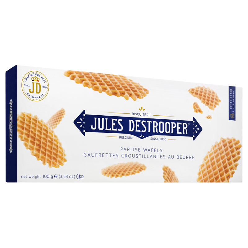Made from Summer butter, Bourbon vanilla, happy chicken eggs and flour. The Jules Destrooper Butter Waffle are a mixture that is transformed into a feather-light crisp biscuit in the oven. Enjoy the glorious taste of real butter which is offset by refreshing vanilla.