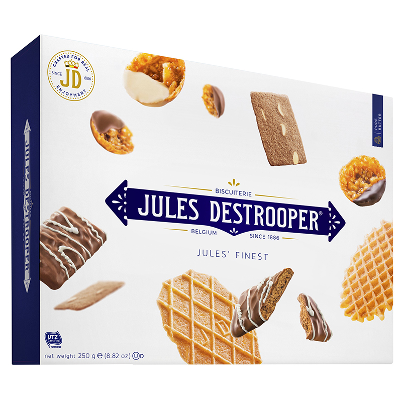 This “Jules Finest” Set contains Almond Thins, Butter Crisps, Butter Waffles, Chocolate Virtuosos and Almond Florentines. The perfect combination of the most prestigious Jules Destrooper biscuits, ideal for those who haven’t decided which are their favourites yet, as well as for gifting!