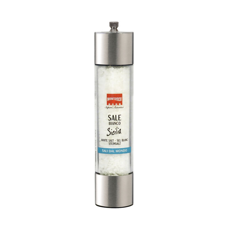 Montosco Salt Sea salt Large Grinder. White in colour, with silver reflections, its production takes place in summer. It is harvested by hand and does not undergo refining treatments or additions of mineral salts.