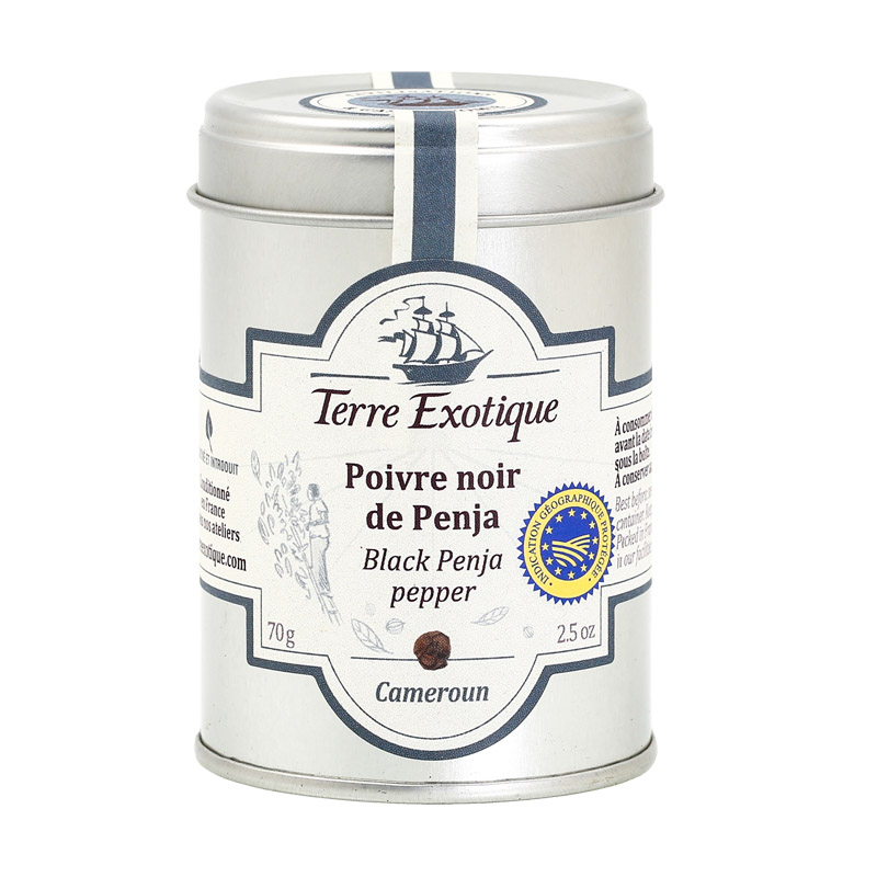 Black Penja pepper from Cameroon grown in the volcanic soil of the Penja Valley in Cameroon. The volcanic soils of Penja give the black pepper its aromas of camphor, incense and leather. Its acidic spiciness and bite bring to mind the tannic bouquet of red wine.