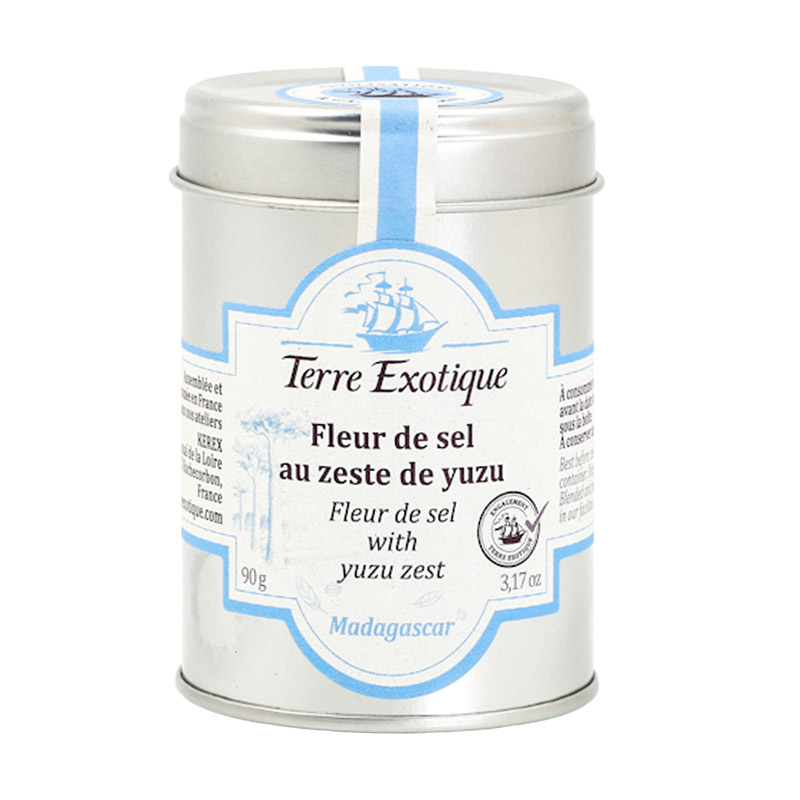 Yuzu is a Japanese fruit, like a small lime and is harvested in October in Kochi prefecture in Japan. It tastes like mandarine or grapefruit and goes perfectly with this fleur de sel from Madagascar.
