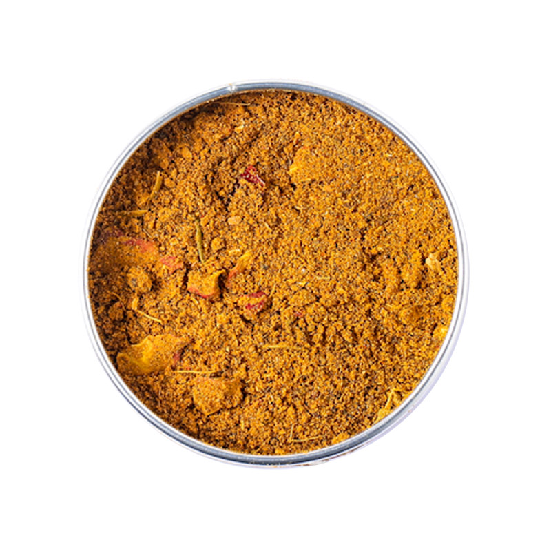 Ginger, turmeric, cumin, cinnamon, coriander, allspice, brown sugar, paprika, black pepper, green cardamom, cloves, nutmeg, rose petals. Packed in France.