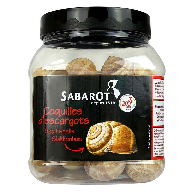 Os caracóis são considerados uma espécie de iguaria francesa – muitas vezes referida como “escargot” e frequentemente cozinhada com manteiga, cebolinha picada, alho, salsa, sal e pimenta. O caracol da Borgonha é geralmente considerado como o melhor dos caracóis pelos gastrónomos. Este frasco contém pelo menos três dúzias de Conchas de Caracóis Helix de calibre graúdo (“very large”).