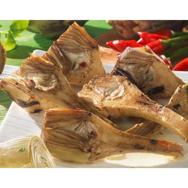 Alcachofras italianas frescas selecionadas, com caule cortado ao meio, grelhado e condimentado pimenta e alho, dão às alcachofras um sabor apimentado mas delicado.