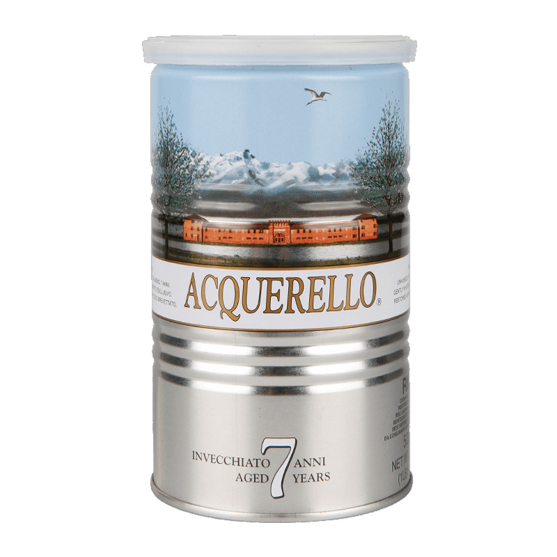 Apenas 1% da produção se torna Acquerello envelhecido 7 anos. A embalagem mais prestigiosa para o arroz mais requintado e valioso. Perfeita para seis-oito pessoas, um presente para verdadeiros conhecedores.