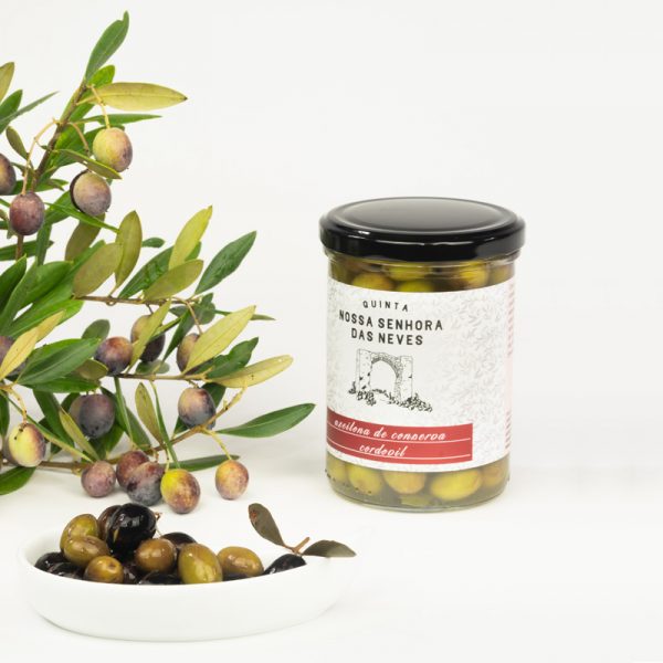 Com a Serra de Medro no horizonte, os olivais que envolvem as ruínas da secular ermida da Nossa Senhora das Neves, brindam-nos ano após ano, com azeitonas de qualidade impar. Desde 1973, as oliveiras da propriedade e o seu fruto são o centro das atenções. O fruto do trabalho ao longo de cada ano culmina na colheita, onde são selecionadas as melhores azeitonas no seu estado de maturação óptimo. Só meses mais tarde, depois de um processo cura natural, se começam a saborar as primeiras azeitonas de conserva, tal como as que se encontra, no interior deste frasco. Nesta cura natural não entra mais nada, para além do tempo, água, sal, orégãos e louro.