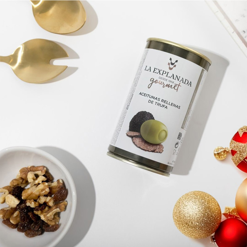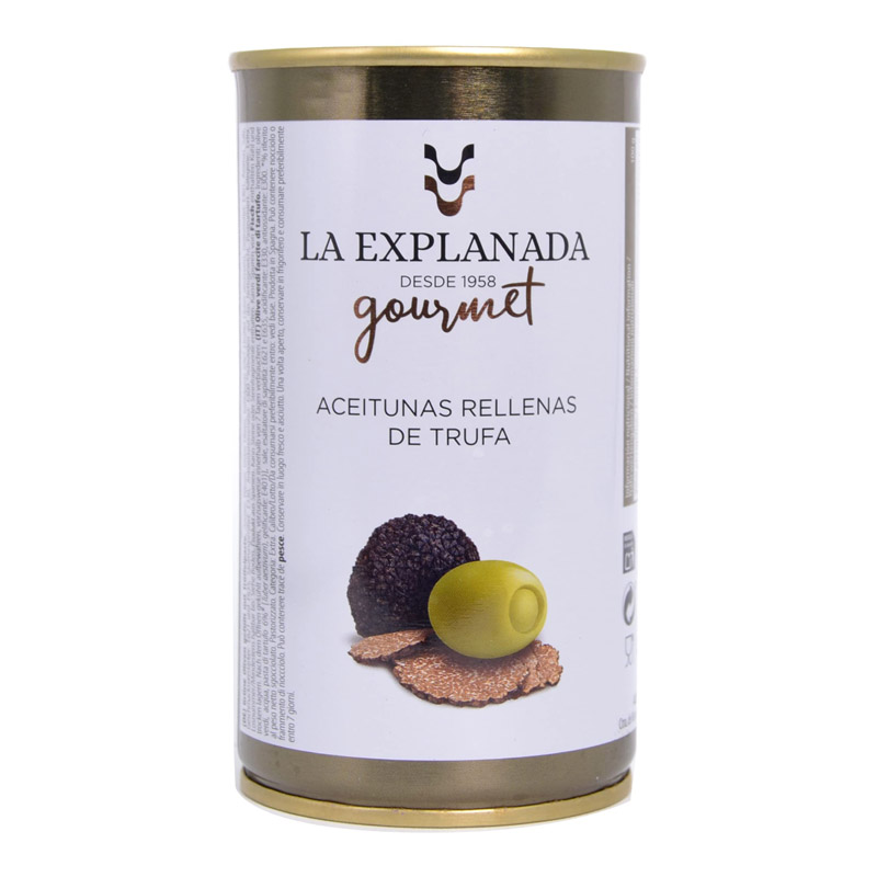 Azeitonas Manzanilla espanholas com trufas pretas premium (Tuber Aestivum). Sabor único e muito equilibrado com um rico recheio de trufa preta. Lanche ou aperitivo ideal.