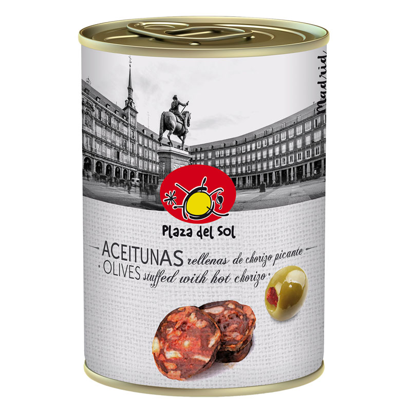 As Azeitonas verdes recheadas com pasta de chouriço da Plaza Del Sol contém chouriço ibérico picante. Uma formula simples que confere um sabor único.