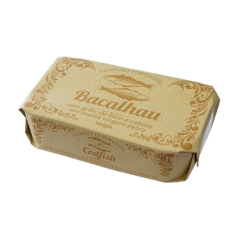 BACALHAU(42%), grão-de-bico (28%), azeite virgem extra(27%), cebola(2%), sal.