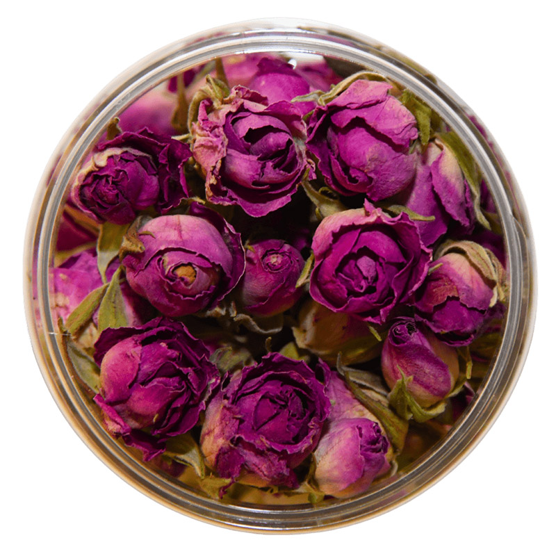 Botões de Rosa Damascena comestíveis de alta qualidade, perfeitos para decorar alimentos e bebidas ou como ingrediente saudável em diversos pratos.