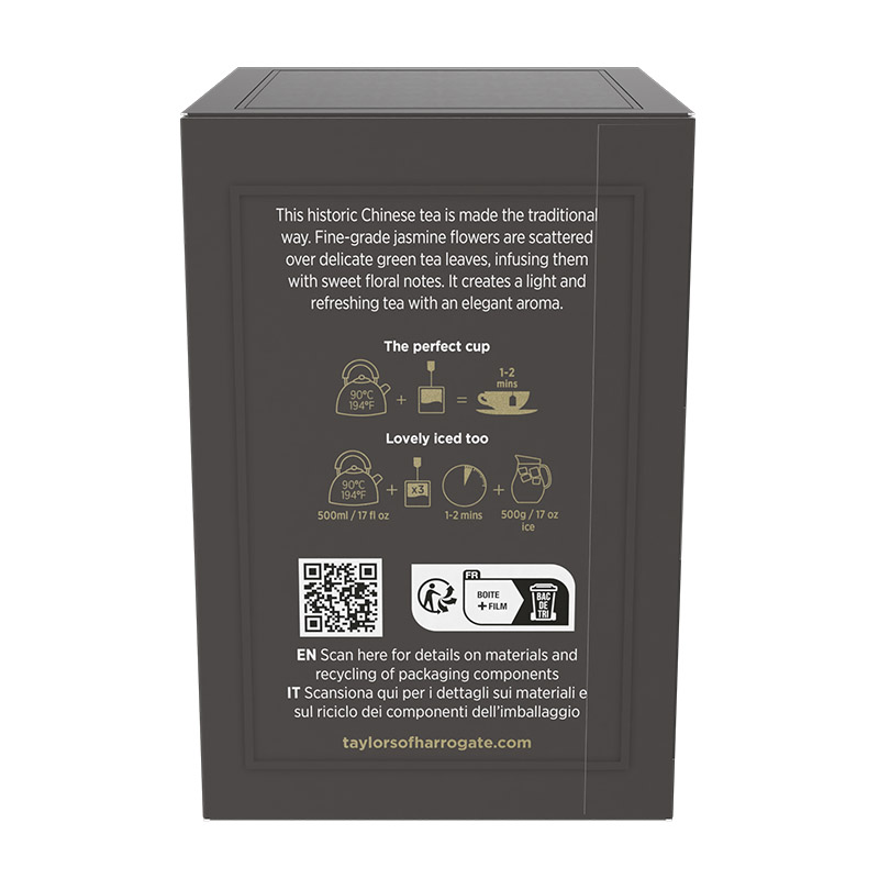 A combinação de chá verde e jasmim remonta há mais de 1000 anos. As flores de jasmim são espalhadas sobre folhas de chá verde e é-lhes dado tempo para as infundir com a sua fragrância, criando uma bebida leve e refrescante com um aroma elegante. O sabor é difícil de descrever, mas impossível de confundir – um toque floral suave que sugere a doçura da flor.