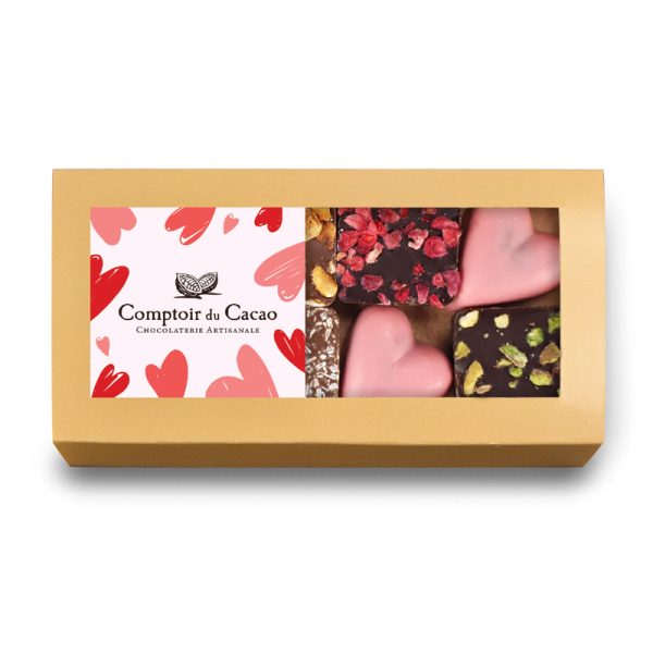 Os quadradinhos são bombons recheados com praliné e cobertos com chocolate preto ou de leite, com avelã, pistácio, caramelo de manteiga com sal, frutos vermelhos.