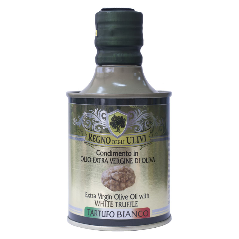 Regno degli Ulivi infundiu trufas brancas de Alba no seu azeite para dar origem a Azeite Extra Virgem com Trufa Branca de Alba. A incomparável finura da trufa branca de Alba trará às suas receitas um lado único e refinado. A sua versão em lata, bastante estética sobre a mesa, irá certamente combinar com os seus pratos do dia-a-dia.