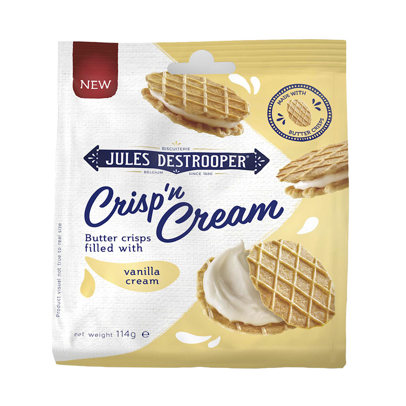 Descubra o snack perfeito: a Crisp ‘n Cream da Jules Destrooper. Duas mini crisps de manteiga recheadas com creme de baunilha.
