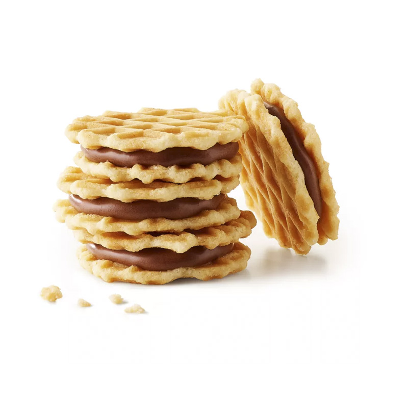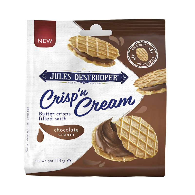 Descubra o snack perfeito: a Crisp ‘n Cream da Jules Destrooper. Duas mini crisps de manteiga recheadas com creme de chocolate preto.