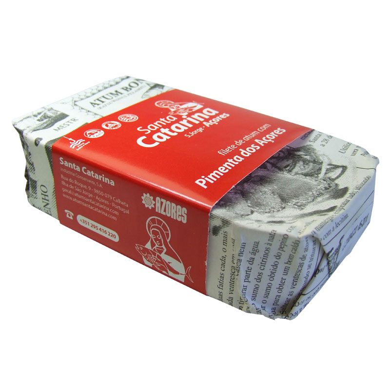 Filetes de atum deliciosamente preparados, conservados em azeite com pimenta dos Açores e ligeiramente temperados de sal. Atum capturado nas águas do Atlântico com linha e anzol, através de uma arte de pesca tradicional e centenária conhecida como “salto e vara”. Depois faz-se a cozedura em salmoura, segundo a tradição dos antigos conserveiros da ilha de São Jorge. Como resultado, um atum de sabor e textura incomparáveis.