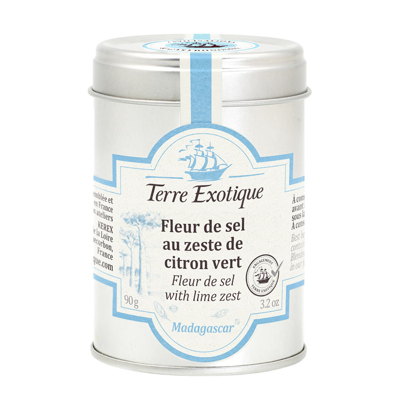 Flor de sal marinho, raspas de lima. Embalado em França.
