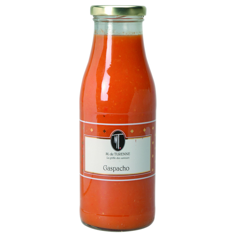 Este Gaspacho Andaluz da M. de Turenne contém tomate, pimenta, cebola, pepino, azeite extra-virgem, sal, vinho, vinagre, alho e especiarias. Composto por ingredientes 100% naturais, este produto M. de Turenne promete trazer um toque de frescura à sua tarde ou noite acompanhado de todos os sabores e odores característicos de Andaluzia.