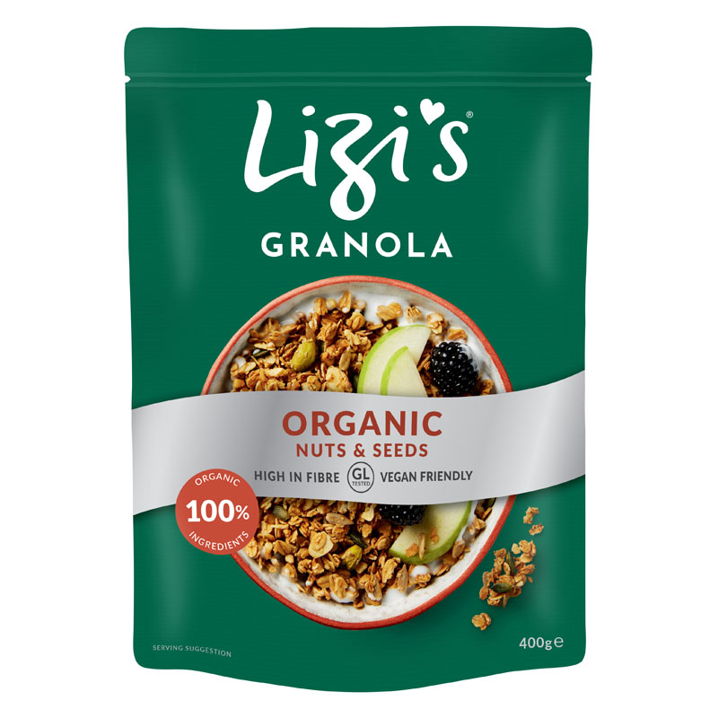 Uma granola com certificação de produção biológica e um delicio sabor. Esta granola contém cereais de aveia tostados, nozes e sementes mistas. É adoçada com xarope de agave do México, e todos os ingredientes são biológicos. O xarope de agave é o açúcar com menor carga glicémica existente e é também é usado como um dos ingredientes da tequila! A agricultura biológica é algo em que a Lizi’s acredita e uma vez que a promessa é promover a sensação de bem-estar induzida pela ingestão de boa comida, as granolas da