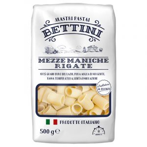 Destaca-se pelas suas paredes grossas e riscadas, que permitem reter os molhos e os sabores com intensidade. Produzido a partir de uma seleção criteriosa de trigos-duros, a Massa Mezze Maniche Rigate apresenta um formato diferenciador, estriado e com espessura equilibrada. Ideal para absorver molhos e sabores, mantendo a consistência e tornando os pratos únicos e elegantes.