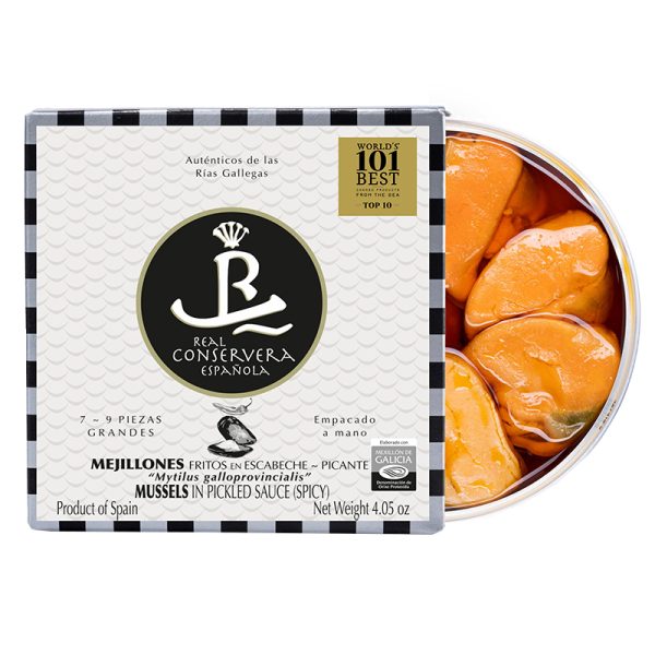 Mexilhões cozidos, fritos em azeite e acompanhados com um molho artesal de escabeche picante. Esta conserva consta com 7 a 9 peças com uma textura macia e um sabor com nuances de vinagre do molho artesanal de escabeche.