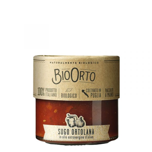 Este refinado e autêntico molho á Ortolana é criado pela cozedura lenta das cebolas, cenouras, aipo, alho e azeite virgem extra. Adiciona-se polpa de tomate e pasta de tomato, juntam-se ao preparado os três vegetais biológicos: abóbora, berinjela e pimento. No fim junta-se salsa e oregão que fornecem um sabor fresco. Este molho não contém aditivos e açúcar.