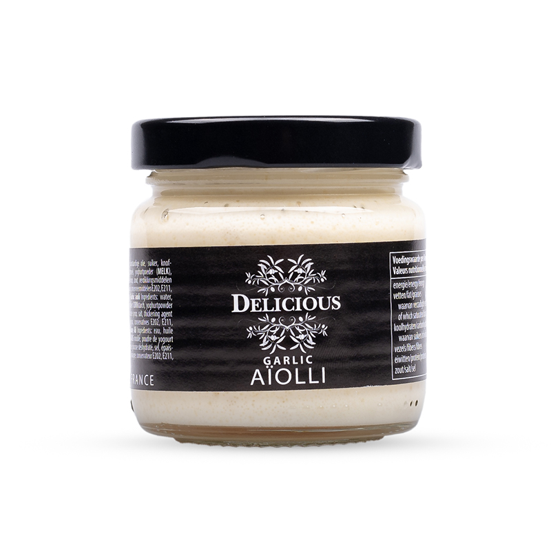 Molho de alho cremoso. Aiolli é originalmente um autêntico e simples molho de alho catalão feito de alho e óleo. Também é um produto popular na França, é delicioso para combinar com saladas, carnes e peixes, pão e, claro, em vários pratos de tapas.