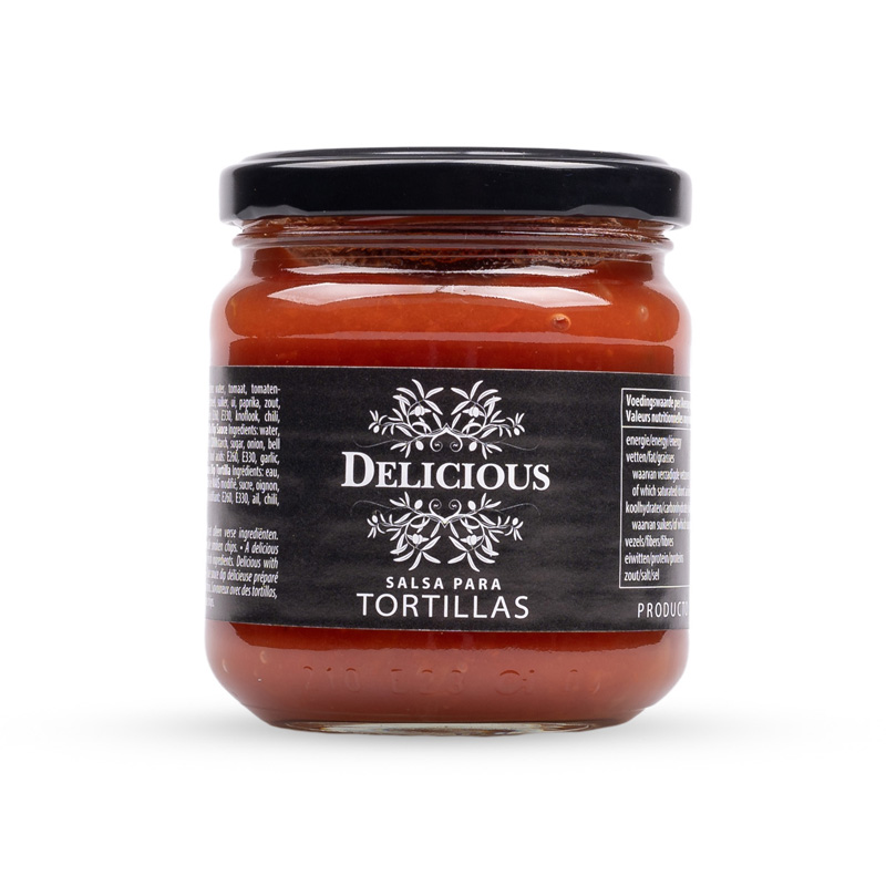 Molho de tortilla com tomate. Um delicioso molho robusto preparado apenas com ingredientes frescos, incluindo os melhores tomates, cebolas, pimento e, claro, pimento jalapeño. Sirva com batatas fritas (tortilla), espalhe sobre um wrap ou taco, ou combine ao seu gosto!