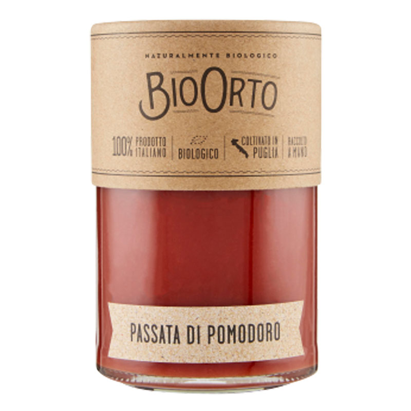 Passata , a preferida dos italianos. Este molho espesso é feito de purê de tomate sem sementes e casca. Os tomates biológicos crescem em Gargano, uma península montanhosa na província de Foggia, Itália. A Passata é uma boa base para sopas e molhos tradicionais, devido à sua textura doce e cremosa. Além do forte sol italiano, os únicos ingredientes são água e uma pitada de sal. Os tomates são ricos em minerais e vitaminas A e C, e têm altos níveis de licopeno , um poderoso antioxidante .