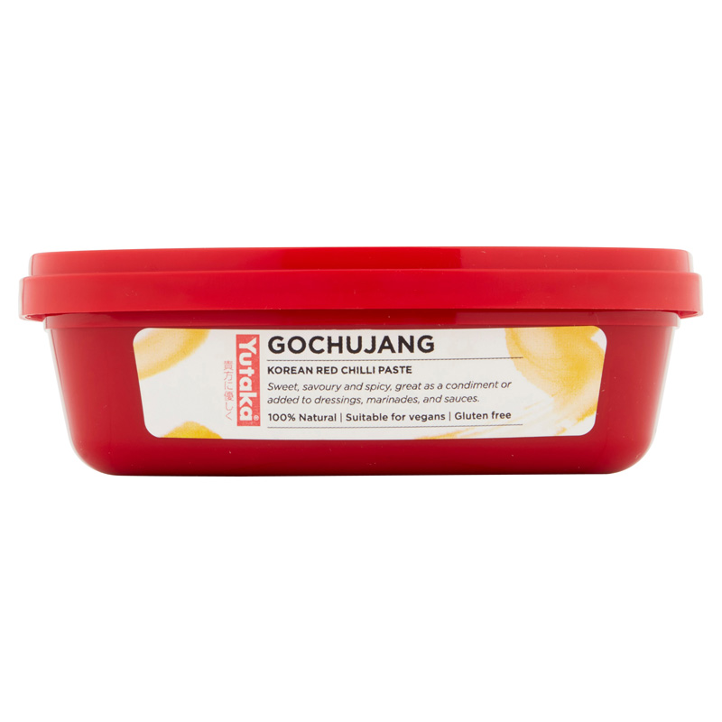 Gochujang é uma condimento coreano feito com uma pasta fermentada de malagueta, arroz glutinoso, soja e sal e é um dos condimentos mais importantes nesta culinária. O Gochujang da Yutaka é muito saborosa, picante e ligeiramente doce. Ótimo como condimento ou adicionado a molhos, marinadas e temperos. 100% Natural, adequado para veganos e sem glúten.