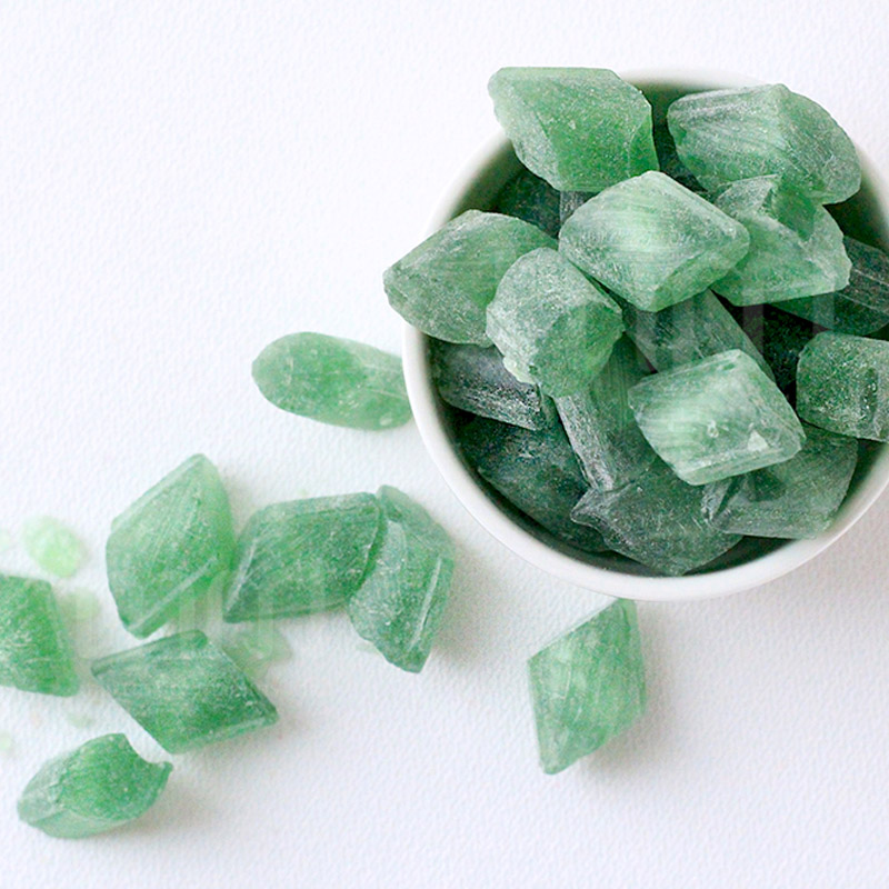 Açúcar, glucose, regulador de acidez E330, aroma de menta e eucalipto, corante E141.