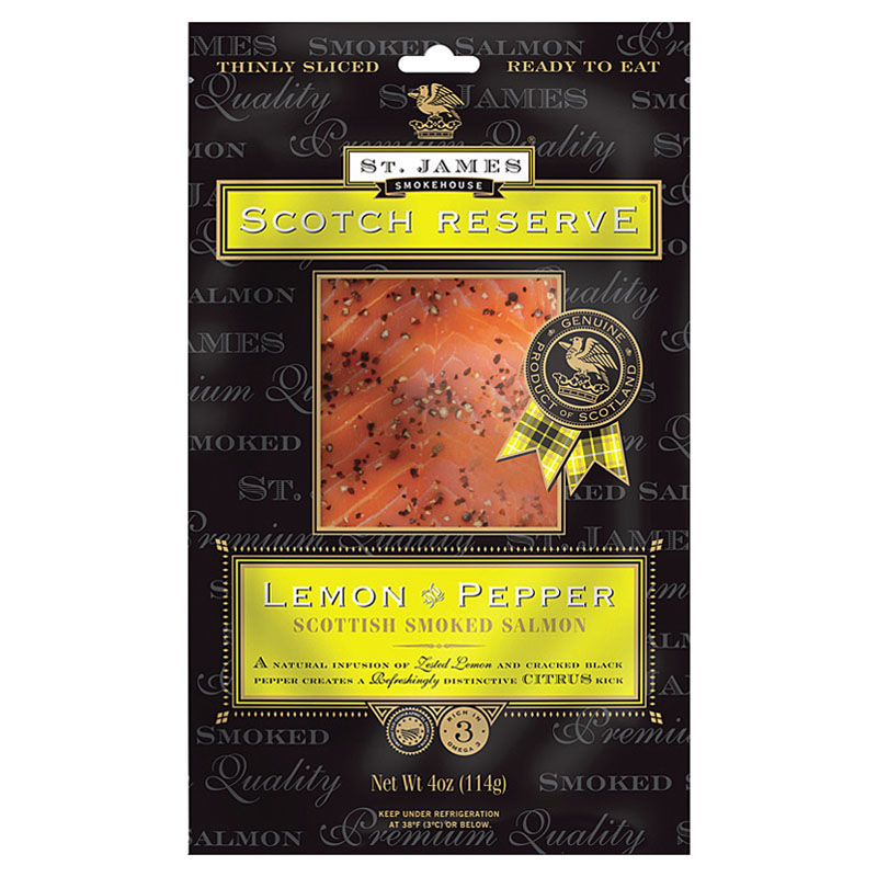 A St. James orgulha-se de ter um dos melhores salmões fumados do mercado. É garantido que, onde quer que encontre o símbolo da St. James, terá uma garantia de qualidade, integridade e, acima de tudo, a satisfação do consumidor. Este Salmão Fumado Limão Pimenta da St. James é fumado utilizando todas as técnicas e procedimentos habituais da St. James sendo acrescentado no fim sumo de limão e pimenta antes de ser embalado a vácuo.