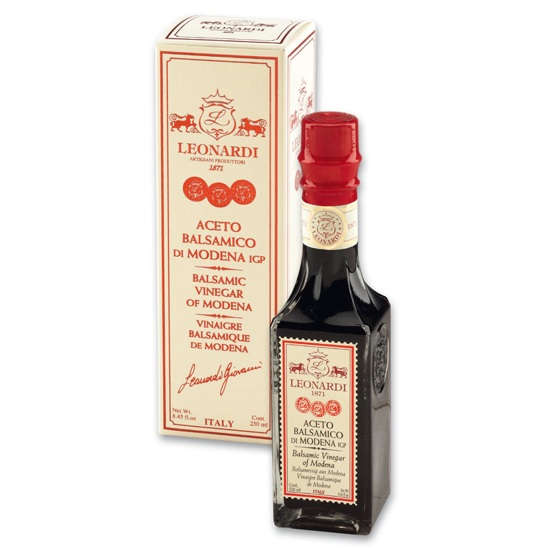 O Vinagre Balsâmico 6 anos da Leonardi contém uma cuidadosa mistura de mosto de uvas cozidas e vinagre de vinho de alta qualidade. Grosso como xarope de Ácer e ligeiramente picante, com o aroma de framboesas e um final fresco e ácido. Se ainda não está convencido, saiba que Leonardi é servido no Palácio de Mónaco, no Eliseu, assim como em muitos restaurantes estrelados.