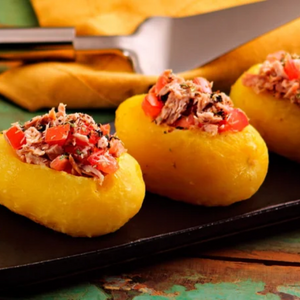 - Preencha a cavidade das batatas com o recheio de atum. Salpique sal, pimenta e orégano.