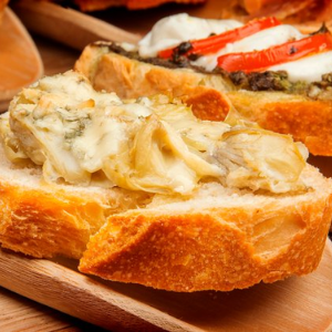 A Bruschetta de Alcachofra e tomate é muito saborosa e leva um recheio de alcachofra, tomate, queijo parmesão e maionese sobre uma fatia de pão torrada.