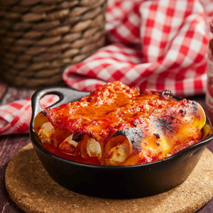 - Coloque os canelone numa panela e cubra-os com o molho. Asse a 180°C por cerca de 20 minutos.