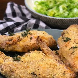 4. Bater os ovos inteiros num prato fundo. Colocar a farinha e o pão ralado em dois pratos separados e passar os pedaços de coelho pela farinha e depois pelos ovos batidos, terminando com o pão ralado;