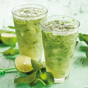 - No liquidificador limpo e seco coloque o gelo e triture durante 6 segundos até que o gelo fique uniformemente triturado e, se necessário, triture mais uns segundos na mesma velocidade. Retire o gelo e junte o mesmo no jarro, envolva coma espátula e sirva de imediato, decorando cada copo com 1 folha de hortelã.