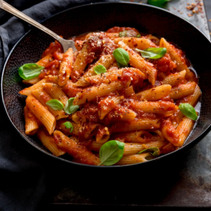 - Cozinhe a massa penne numa panela grande com água a ferver e temperada com sal, de acordo com as instruções da embalagem. Escorrer a massa, reservando 1 chávena da água.