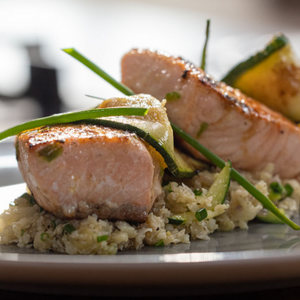 10. Para servir, num prato faça uma cama de cuscuz, coloque o salmão por cima e depois a curgete. Decore com cebolinho e tempere com umas gotas de sumo de limão.