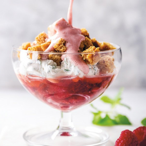 - Finalize os copos em camadas: a mousse vem por cima das framboesas, depois os cubos de pain d’épices e depois o coulis.